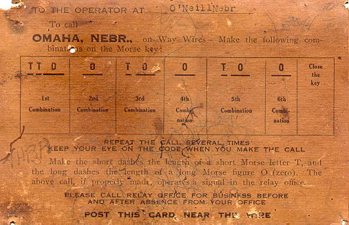 * If needed for a new office having no code assigned state "Code unassigned" and also whether for W. U. or railroad office. ++++++++++++++++++++++++++++++++++++++++++ John Casale sent a set of instructions for a Gill Selector that was used in O'Neill, Nebraska to get the attention of a Western Union operator via the gill selector in Omaha, Nebraska. |