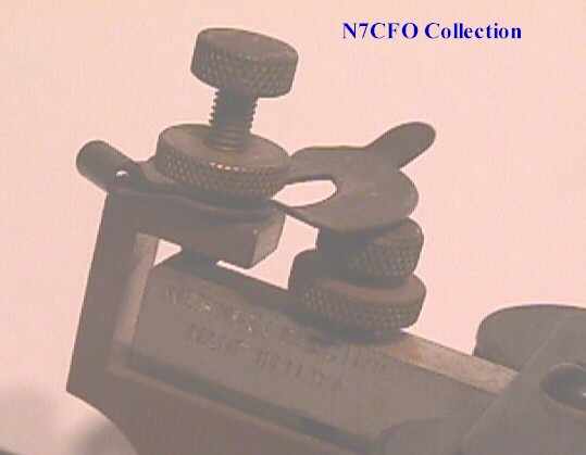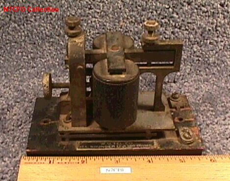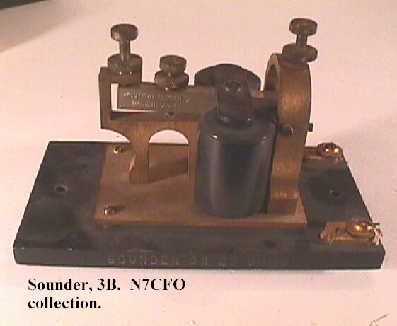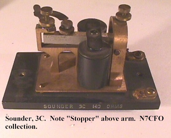 | SOUNDER, MAIN LINE, 15-C OR 15-AC. | An older type of sounder now used only in KOB service. Air gap is varied by moving sounding bar trunnion up or down in arch, and spring tension is varied by thumb screw mounted in small brass box. 15-AC is 150 ohms (many of these are marked 15-A, but are of 15-C mechanical design) 15-C made in 25 and 100 resistance, current 70 and 40 mils respec. | |||||||||||||||||||||||||||||||||||