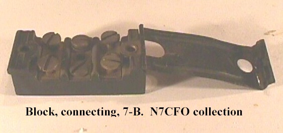 Used as a connecting point between flexible wires of arm resonators; registers and the wiring of the associated equipment; also on various telegraph sets. See also 73-A. Composition base with three pairs of screw posts for three individual circuits. Has hinged metal cover to protect screw posts. L--2 1/8", W--1". Ht--7/8". | ||||||||||||||||||||||||||||||||||||