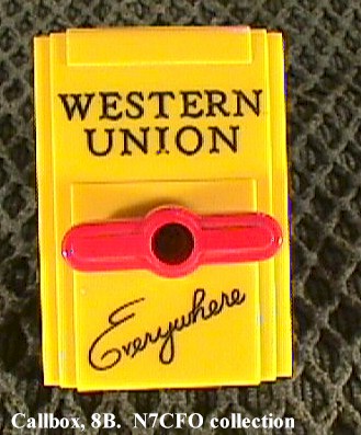 Used on messenger call circuits to send coded signal. A clockwork mechanism mounted on an oval porcelain base, enclosed by metal cover through which operating handle projects. Rotation of handle winds up mechanism so will open and close call circuit through code wheel and contacts when handle is released. Binding posts are concealed by cover but have exposed lugs to afford quick testing. Code wheels must be ordered separately. L--5-7/8", W--3-5/8", Ht (over handle)--3". * Type 4-B (Specn. E-63) is much similar (but has exposed binding posts) and is used interchangeably. Type 6-A is much the same as 6-B but does not have test lugs. Type 5-A (Specn. 577) now obsolete, was designed to fit standard single gang flush wall switch box. |
