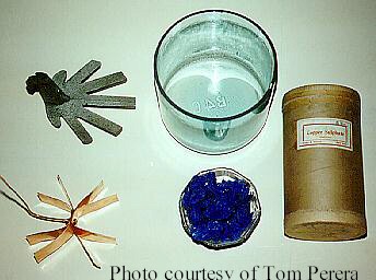 zinc) hung near the top, and copper electrode (battery copper) in bottom surrounded by blue vitriol