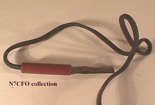 Used on semi-automatic sending machines ("bugs") Double conductor cord about 24" long and 1/4" dia. with cord tips at one end and special wedge plug at other to fit under circuit closing lip of Morse key. | ||||||||||||||||||||||||||||||||||||