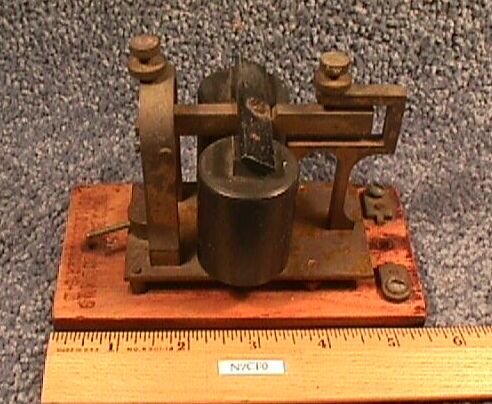 | SOUNDER, MAIN LINE, 15-C OR 15-AC. | An older type of sounder now used only in KOB service. Air gap is varied by moving sounding bar trunnion up or down in arch, and spring tension is varied by thumb screw mounted in small brass box. 15-AC is 150 ohms (many of these are marked 15-A, but are of 15-C mechanical design) 15-C made in 25 and 100 resistance, current 70 and 40 mils respec. | |||||||||||||||||||||||||||||||||||